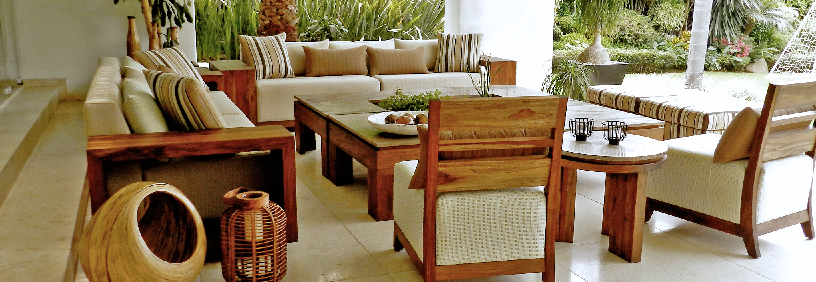 Diseñamos y fabricamos mobiliario de exterior con maderas de teka, cumaru y amazonia entre otras; salas en tejidos de mimbre sintético armados con cascos de aluminio y cojinería en telas de exterior, sillería en cuerda de poliéster, combinamos diferentes tipos de piedra y mármol, así como acero inoxidable.